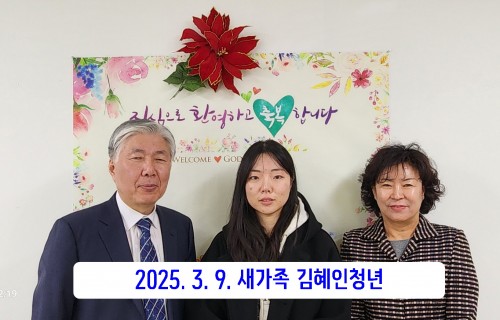2025.3.9 새가족 김혜인청년 작성자신목교회 등록일 25-03-18 조회358회 이름신목교회 본문 사랑하고 축복합니다. 2025. 4. 20일 새가족 장경철성도 김경숙성도(정연경집사인도) 2025.1.26 새가족 전지웅성도 목록