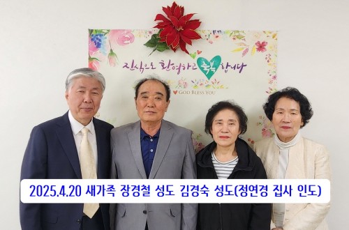 2025. 4. 20일 새가족 장경철성도 김경숙성도(정연경집사인도) 작성자신목교회 등록일 25-04-24 조회363회 이름신목교회 본문 2025. 4. 20일 새가족 장경철성도 김경숙성도(정연경집사인도)사랑하고 축복합니다. 2026. 2. 8일 새가족 이반석청년 2025.3.9 새가족 김혜인청년 목록