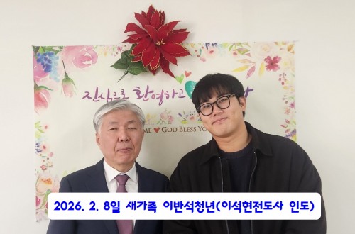 2026. 2. 8일 새가족 이반석청년 작성자신목교회 등록일 26-02-11 조회120회 이름신목교회 본문 2026. 2. 8일 새가족 이반석청년(이석현전도사 인도) 2026.3.29 새가족 이경덕성도 2025. 4. 20일 새가족 장경철성도 김경숙성도(정연경집사인도) 목록